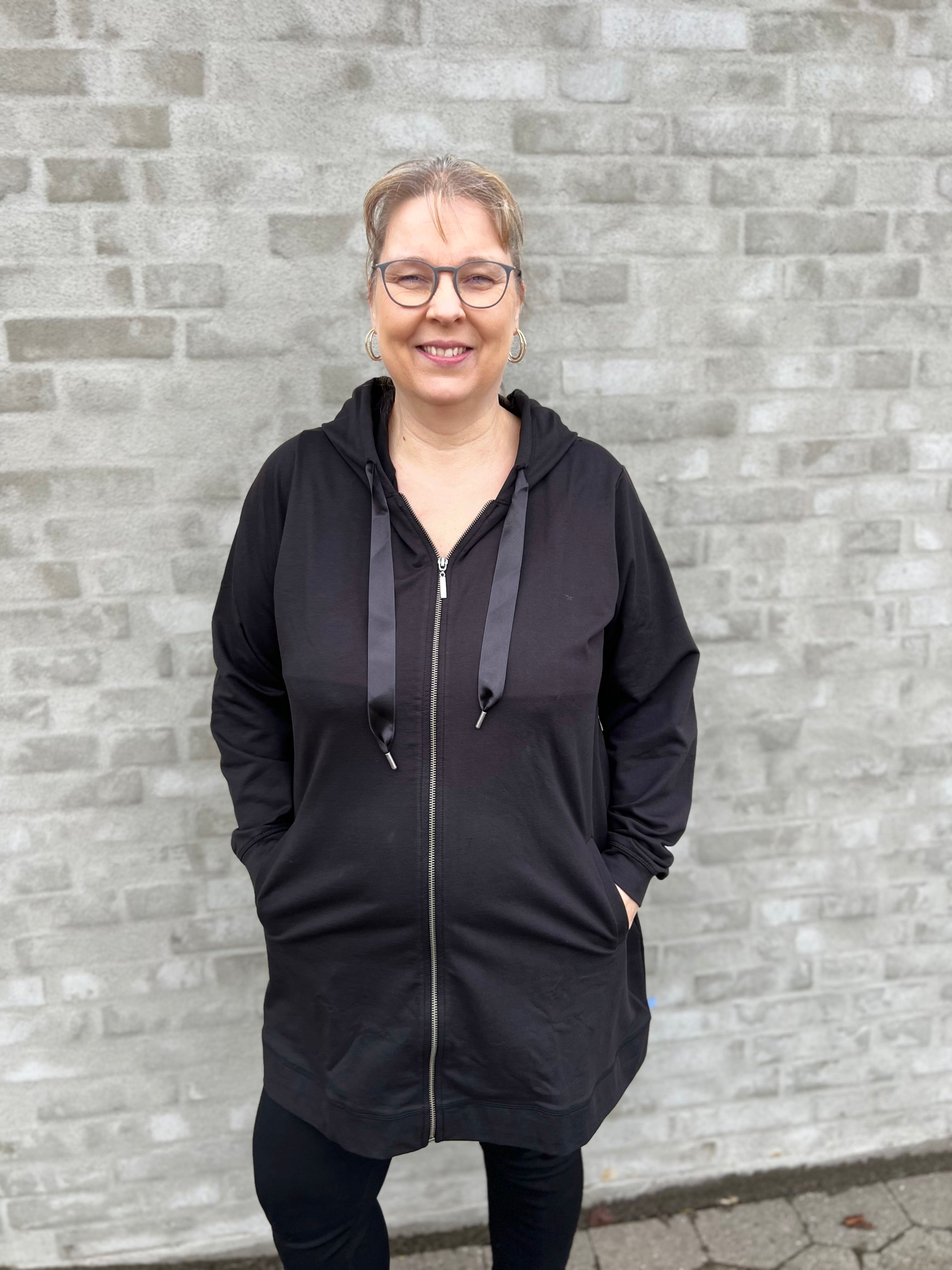 Cardiganen som er med lynlås, lommer i siden og det her fine satin-bånd ved hætten - kan bare bruges til så meget forskelligt..