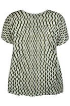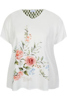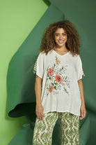 T-shirt med V-hals foran med blomst, bag på med grønt print,